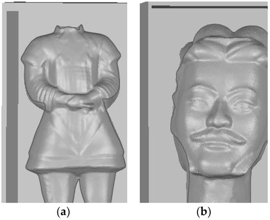 Cultural relics are precious due to their historical, artistic, scientific, and social values. The exchange of precious cultural relics has also become increasingly frequent [,]. The fragile cultural relics need to be packaged carefully during transportation []. Three-dimensional scanning technology is promising for cultural relic packaging. The establishment of high-precision and realistic 3D models of cultural relics is of great significance in digital museums, conservation and research of cultural relics, appreciation and display of cultural relics []. Manually produced 3D models can be used to produce packaging solutions in a simple and time-saving manner. However, there are still some problems to be solved to achieve fast, accurate, realistic, and low-cost three-dimensional measurements and reconstructions of cultural relics [,,,].