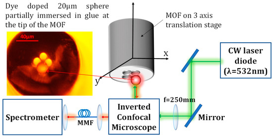 Polystyrene (PS) microspheres (nps = 1.59, Φ ~ 20 µm from Polysciences Inc., Warrington, PA, USA) were doped with Nile Red (λexc = 532 nm, λem ≈ 590 nm) using a two-phase liquid system described in our previous work [17]. The UV curing glue with a RI of ~1.382 at 590 nm once cured was purchased from Norland Products Inc., Cranbury, NJ, USA. A Microstructured-core Optical Fiber (MOF) contains four air holes of ~15 μm diameter towards the center (the details regarding the MOF design can be found in ref. [18]), and was used to hold the sphere and maneuver it into different liquids. We assembled the sensor in the following six steps. (a) A 10 cm freshly flat-cleaved MOF (held by a three-axis translational stage) was positioned above an inverted microscope. (b) The MOF was then carefully lowered down to lightly touch a droplet of fresh glue pipetted onto a glass coverslip, positioned on the inverted microscope (IX71, Olympus, Tokyo, Japan), allowing the glue to infiltrate the air holes through capillary forces. (c) A UV torch (λ = 365 nm, illumination: 300 mW/cm2) was used to partially cure the glue at the end of the MOF, thereby increasing its viscosity, and thus preventing it from flowing down and engulfing the whole sphere in the later stage. (d) A new glass coverslip with dried 20 μm microspheres resting on top was then placed on the inverted microscope. A microsphere was selected from many on the coverslip based on the criteria that the Q-factors of the fundamental WGMs must be above 2 × 104 under the free space excitation and collection approach. (e) Once an appropriate microsphere was located, the MOF filled with partially cured glue was carefully lowered down to fetch the selected microsphere into one of its holes. (f) Lastly, the glue was fully cured using the UV torch to securely adhere the sphere to the hole of the MOF, as seen in the inset of Figure 1. The cured glue also provided a seal to prevent liquid from entering the holes of the MOF.