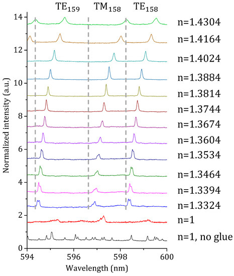 Next, we collected 12 WGM spectra, also shown in Figure 2, as the MOF with sphere was dipped into liquids of RI ranging from n = 1.3324 (pure water) to 1.3884 (40% glycerol solution) at 0.0070 RI intervals, followed by ~0.0140 RI intervals to 1.4304 (70% glycerol solution). We conducted numerical simulations to fit the resonance positions (i.e., central wavelengths) of the fundamental TM and TE modes, shown in the three spectra of Figure 2, to gain an estimated value of the sphere size and the glue coverage. The numerical simulations solve the eigenvalue equations for the fundamental TM and TE modes in a microsphere and return the central wavelength positions of the modes of interest [19] based on the following inputs: Refractive index of the sphere, average refractive index (based on the weighted percentages of the glue and liquid) of the environment, diameter of the sphere, and wavelength range of interest. We selected three WGM spectra, where n = 1.3744, 1.3814, and 1.3884, which are those closest to the RI of the glue for all liquids tested. Using the measured WGM spectra in known glycerol solutions, the best fit can be found for the sphere size and the average coverage of the sphere after a standard iteration process. It was found that a sphere size of Φ ≈ 19.8 µm and an estimated glue coverage of 49% on the sphere surface provided the best fit of our experimental results. It is to be noted that the estimated glue coverage is for general guidance.