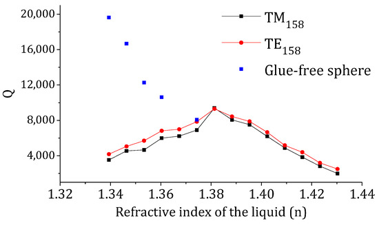 Equation (3) shows that both the distribution of the glue on the sphere surface and the RI difference between the reference glue and the surrounding liquid contribute to the strength of mode-splitting. The Q dependence on nliquid, i.e., the slope of the black or red dotted line in Figure 3, is due to this mode-splitting. From Equation (3), it can be inferred that before the fundamental TM or TE mode cutoff, the higher the RI of the glue and the larger the term Chigh–Clow, the steeper the slope of the black (or the red) dotted line in Figure 3 would be.