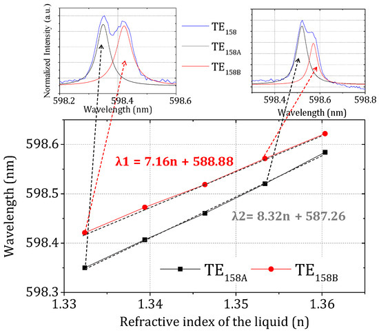 Measured resonance wavelengths as function of the surrounding RI for two sub-modes in TE158.