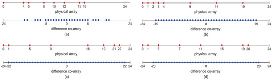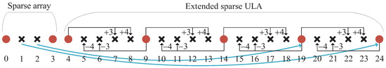 Figure 4 illustrates one moving scheme of the NA with . 2 from and 1 from are respectively moved to 19 and 24. Comparing Figure 3 and Figure 4, one can find that this scheme thins the dense sensors and reduces the redundancy between the difference and sum sets. Furthermore, all the holes in the extended sparse ULA can be filled by the difference and sum results of the elements in and the remaining dual pair elements 3, 4. Therefore, the newly formed array could have a larger co-array aperture than the NA. Although the scheme has the above advantages, it will result in some new holes in the original dense ULA part, e.g., holes 1 and 2 in Figure 4. Thus, in order to increase the DOF as large as possible, filling these new holes becomes an important issue that needs to be resolved when considering how to select the dual pair elements to move.