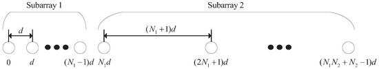 As shown in Figure 2, the NA consists of two ULAs. Subarray 1 is a dense ULA including sensors with the inter-sensor spacing of one unit. Subarray 2 is a sparse ULA containing sensors with the inter-sensor spacing of units. The total sensor number of the NA is . For convenience, we normalize all the locations by the unit inter-element spacing d. Then, the location set of the NA can be represented as , where and .