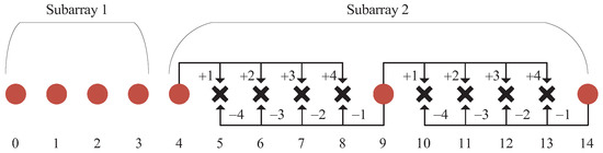 From Definition 1, one can know that, when retaining all the elements (e.g., and ) in , a specific hole in the NA can still be filled even if one element in the corresponding dual pair is eliminated. To illustrate this characteristic clearly, we depict in Figure 3 how the holes in the NA with can be filled by the difference or sum results of and . Table 1 summarizes all the dual pairs in Figure 3. Take the hole location 6 for example. In the premise that are retained in the sparse ULA, if 3 is removed, one can still use 4 + 2 to form 6. Similarly, if 2 is moved away, 9 − 3 can be used. Therefore, either element in the dual pair can be used to fill the hole location 6. It is noted that and are the same dual pair—so are and . Figure 3 and Table 1 also show that the dual pairs used to fill holes between any two adjacent sensors of Subarray 2 are exactly the same. This property always holds whatever the sensor number is. Denote the number of dual pairs in NA as . In the following proposition, we provide the closed form expression of the dual pairs.