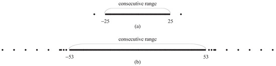 Combining Definition 2 and Proposition 3, it is clear that, for case 1 and case 2, there exists the relationship . For case 3, the relationship becomes . Thus, Proposition 3 reveals the hole-free property of the DSCa of the DsNA in the range . This means that the development of the DsNA can solve the hole issue caused by the dual pair element movement. Figure 6 shows the DSCa of the two configurations in Figure 5. One can find the DSCa of the DsNA contains all the consecutive elements in the range , where 53 is the physical aperture. However, the DSCa of the NA only comprises consecutive elements from −25 to 25.