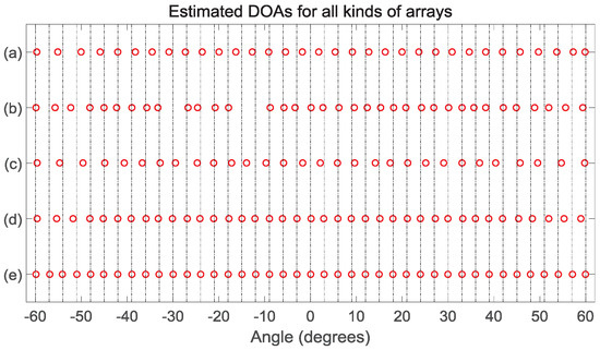 The estimated DOAs ( and SNR = 10 dB): (a) the NA with the VCAM used; (b) the ANAII1 with the SS MUSIC used; (c) the ANAII2 with the SS MUSIC used; (d) the CA with the VCAM used; and (e) the DsNA with the VCAM used.