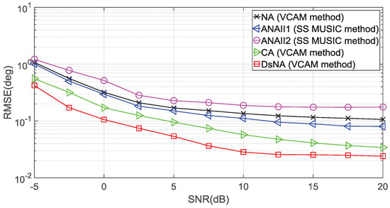 In Figure 9, we suppose that to evaluate the RMSE performance as a function of the input SNR. It can be seen that the performances of the five configurations improve considerably when the SNR increases. The DsNA with the VCAM used outperforms the other four arrays since the DSCa(DsNA) contains more consecutive elements than the other four virtual arrays.