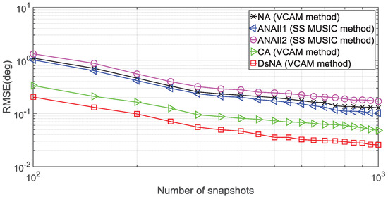 In Figure 10, we set SNR = 10 dB and to evaluate the RMSE performance as a function of the number of snapshots. Similarly, the performances of all the configurations improve with the number of snapshots increasing. The DsNA with the VCAM used still performs better than the other four arrays, due to the larger consecutive range of its virtual array. From the two simulations, one can find that, even when the SNR and the number of snapshots are large, there is an obvious gap between the DsNA and the other four array configurations.