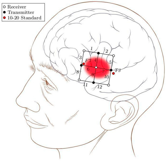 A 12-channel square patch with an inter-optode distance of 3 cm was placed with T3 on one end and F7 on the other. An estimation of the underlying anatomical structures is also shown with Broca’s area highlighted. The head diagram is available at [35].