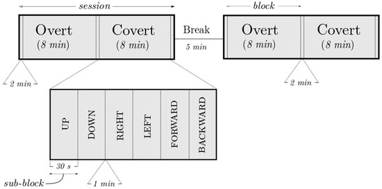 The experiment (see Figure 2) was composed of two sessions with a 5 min break between them so as to collect as many trials as possible while allowing some time for relaxation too. Each session was composed of a selected set of directional words (up, down, right, left, forward, and backward) overtly and covertly said for 30 s, at a frequency of 1 Hz. Within a session, the order of blocks (overt, covert) as well as sub-blocks (‘UP’, ‘DOWN’) was randomized. A 1 min break was allowed between sub-blocks to avoid any carry-over effect; similarly, an additional pause of one minute was also added before each block. Each session thus lasted for about 22 min and a complete experiment had a duration of about 49 min excluding mounting time.