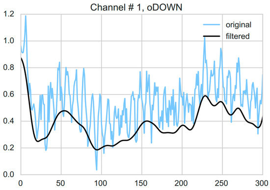An example showing both raw (blue) and filtered (black) HHb response corresponding to the first channel of one of the sub-blocks i.e., overt DOWN of one of the subjects. Filtering was performed by first removing the linear trends from the response and then using a fourth order Butterworth filter with a cut-off frequency of 0.5 Hz to account for the effects of the cardiac pulse.
