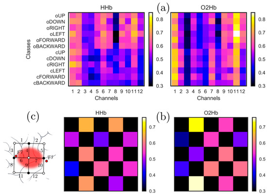 Near-Infrared Spectroscopy (NIRS), a relatively recent non-invasive neuroimaging technique [7,8], makes use of electromagnetic radiation in near-infrared region (650–900 nm) [9] in order to measure functional activation in cortical areas 1–3 cm beneath the scalp [10]. Among dominant chromophores that also happen to be biologically relevant markers for brain function are oxy-hemoglobin (O2Hb) and deoxy-hemoglobin (HHb) [11]. NIRS has emerged during the last decade as a promising non-invasive neuroimaging technique and has been used to map different areas of the brain including primary motor cortex [12], visual [13], as well as cognitive and language functional areas [8,14,15,16,17,18,19,20,21]. Naito et al. [22] presents a study conducted on 40 Amyotrophic Lateral Sclerosis (ALS) patients including 17 in locked-in state in order to investigate the use of high-level cognitive tasks as a control signal for a BCI. Single-channel measurements were recorded over the prefrontal cortex while participants performed mental tasks corresponding to ‘yes’/‘no’ in response to a series of questions. Instantaneous amplitude and phase of the NIRS signal were selected as features and a non-linear discriminant classifier was used to achieve an average classification accuracy of 80% (for 23 out of 40 participants). While EEG-BCIs haven’t succeeded in breaking the silence of Completely Locked-in (CLI) patients [23], a recent clinical study [24] presents a Class IV case evidence proving that NIRS-BCIs could significantly improve the QoL of such people by allowing them to regain basic communication. Nevertheless, studies focusing on directional actions, which might be beneficial for moving in space, are lacking.