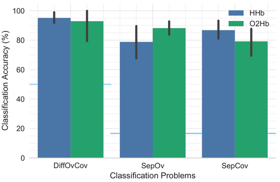 Mean classification accuracy for the different classification strategies. The height of each bar indicates mean classification performance and the error bars indicate bootstrapped 95% confidence intervals estimated by resampling participants (1000 bootstrap samples). The blue horizontal lines show the chance-level performance for the corresponding pairs of bars.