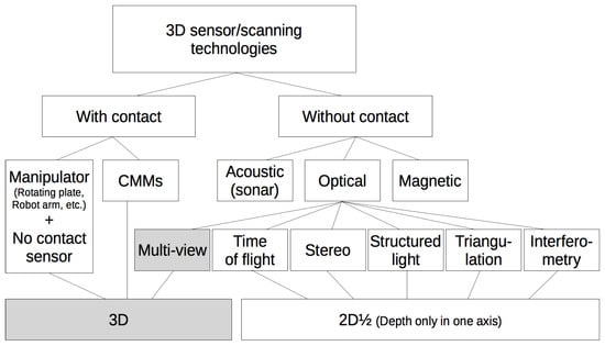 In [7], a survey of recent non-contact 3D scanners with a classification of their technologies and an overview from a manufacturing perspective is presented along with potential manufacturing applications and the practical requirements of typical industrial tasks. In [8], the resulting data files obtained from various types of 3D scanners are analyzed. In Figure 1, a taxonomy of the existing 3D scanning technologies is shown.