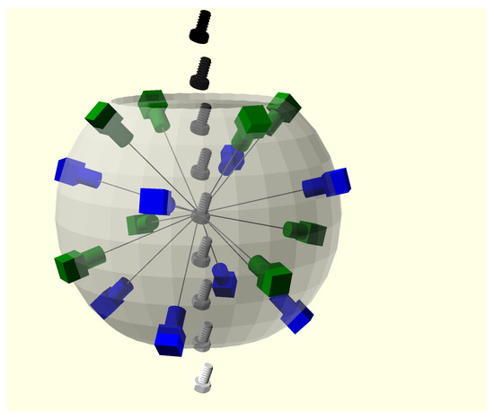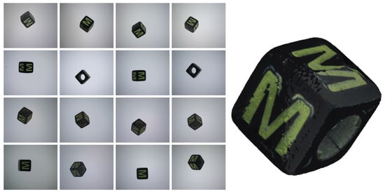 After a number of simulation analyses on different industrial objects to characterize the inspection quality and tolerances that can be expected from the system in various tasks, we found that the larger the number of cameras used, the better the results were (see Section 5 and Figure A1 in Appendix A). We decided to use 16 views due to the increasingly high costs of the hardware (cameras, lenses, mechanics and interface electronics, along with the computer power needed) and of the reconstruction and inspection algorithms. We plan to build systems with less/more cameras if we face less/more demanding practical applications.