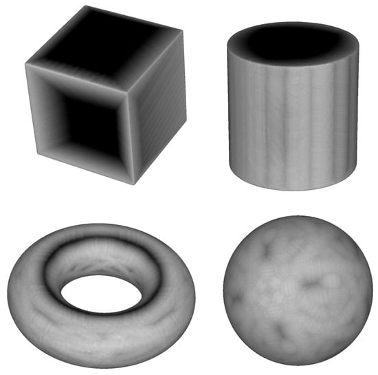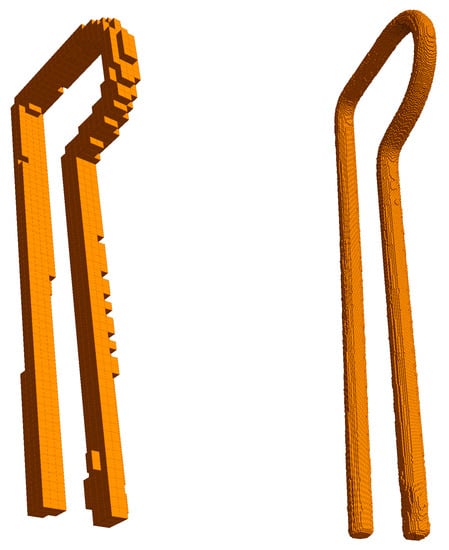 - Lorensen, W.E.; Cline, H.E. Marching cubes: A high resolution 3D surface construction algorithm. In Proceedings of the 14th Annual Conference on Computer Graphics and Interactive Techniques, Anaheim, CA, USA, 27–31 July 1987; pp. 163–169. [Google Scholar] [CrossRef]