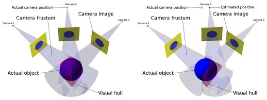 The reason is that the computation of frustum intersections during the carving step produces the loss of important parts of the object even with a minimal deviation in the estimation of the position and orientation of a camera. The volume depicted in light red in Figure 11 illustrates the different results obtained from a camera with a wrong estimated position. In Section 6.1, this can be clearly shown in Figure 19a where a bad reconstruction of a ball is obtained. An even more severe case of this problem is shown in Figure 20a where the reconstruction is very inexact and even a split of the resulting object into several unconnected segments is found.