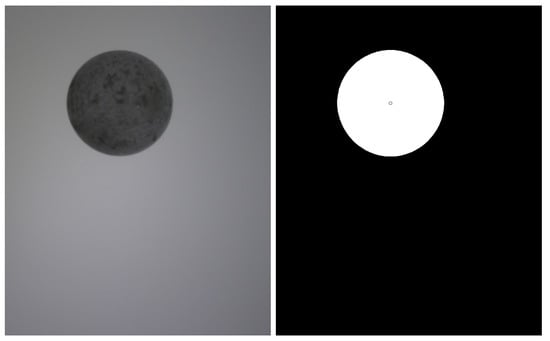 Spherical target used to calibrate. (Left) captured image by one of the cameras; (Right) segmented target showing the center.