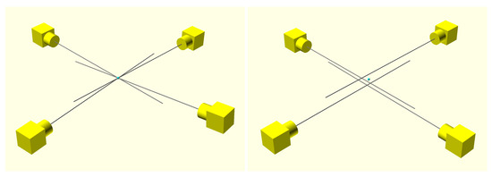 Accurate inter-camera calibration is necessary for many common problems involving the capture of more than one image at the same time. Many works have dealt with this problem [27,28,29,30], but the particular case where several cameras need to be calibrated to a high precision while they do not have available direct lines of sight to a set of common reference points is unusual. The classical procedure works through the calibration of pairs or small sets of cameras that share visible elements in a calibration target or a scene, and proceed in a chain computation until all the cameras are calibrated. This way, a camera is locally calibrated with their neighbor cameras and indirectly with all the rest. Although that procedure works theoretically well, the result often shows accuracy and stability problems, since errors can be accumulated along the chain of computations. In the experiments with our prototypes with 16 cameras, these errors were relevant and generated conspicuously bad results.