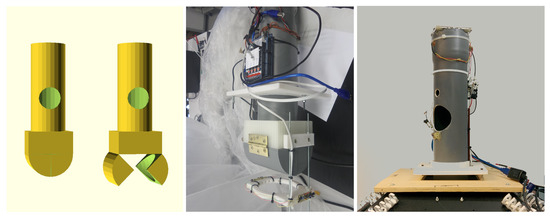 Object sequencer. (Left) the hatch at the bottom controls the fall of the objects; (Middle) the optical sensor that controls the trigger can be seen at the bottom; (Right) the sequencer prototype installed on top of the system, with the entry opening visible.