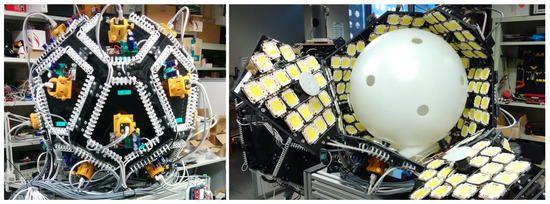 An adequate diffuse illumination is important to avoid shadows and reflections. It is obtained from high-power LEDs also attached to the camera supports or to the inner faces of the polyhedron and conveniently scattered by reflection or by a polycarbonate sphere that acts as a diffuser and a background image for all the cameras.