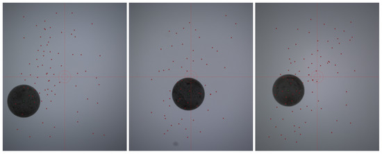 A test was conducted with 79 captures of the calibration object. To avoid the object from following the same path in each capture and thus maximizing the variability, the sequencer hatch was released before the object was stabilized inside it. Thus, a set of acquisitions with the spheres widely distributed in the capture volume was obtained (see Figure 17).