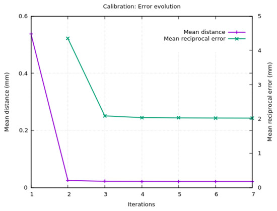 The calibration error was evaluated at each iteration of the algorithm by means of two metrics: on the one hand, we computed the reciprocal error [27] for each camera. This metric averages the distances between the sphere centers and the projections of the computed 3D points () on the image space, giving a measure of the calibration accuracy for each camera. The mean reciprocal error is calculated as the average of the reciprocal errors of all cameras.
