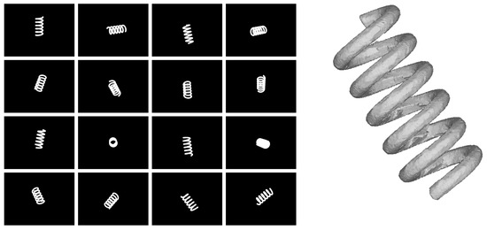 (Left) synthetic silhouettes from the 16 views of a virtual spring; (Right) reconstructed spring.