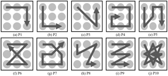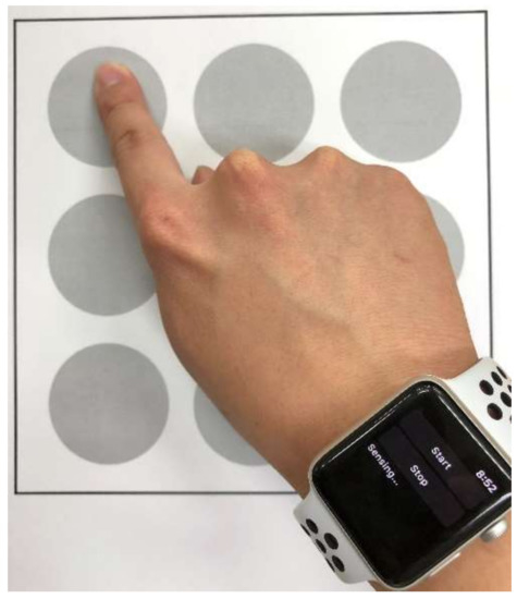 The method used to collect gesture patterns is shown in Figure 4. The participants in the experiment wear a smartwatch on the wrist that they mainly use and perform gestures from the given set of 10 gesture patterns, as shown in the Figure 3. The nine reference points in Figure 4 are offered for the participants’ convenience and the 10 gesture patterns in Figure 3 are shown to the participants who then perform each gesture with the posture, hand shape, and motion that they want to take. In this paper, the gesture patterns are performed on a 2-dimensional flat surface like a desk or a flat plate.