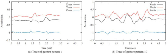 The raw acceleration of the gesture pattern information collected using the smartwatch consists of , , and . Figure 5 shows the one of raw acceleration series of gesture Patterns 1 and 10. It can be seen that due to the different pattern scenarios based on the type of gesture, the amount of runtime and acceleration values vary. For example, there were two rapid fluctuations in Pattern 1, whereas there were more than five fluctuations in Pattern 10. The difference in execution time between two gestures is about 1.5 s.