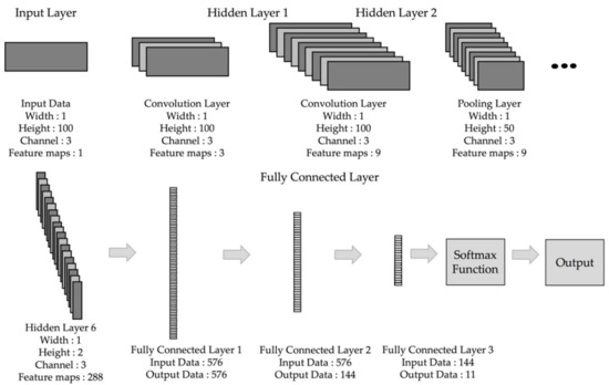 Figure 6 shows the procedure of the designed CNN model. The machine learning classification model generally consists of the input, hidden, and output layers. The designed CNN model can be divided into the input, convolution, pooling, fully-connected, and output layers. The input layer enters the data to be classified based on the input format. The hidden layer consists of the convolution, pooling, and the fully-connected layers. The convolution layer is connected to some area of the input image and calculates the dot product between this connected area and its own weighted value. The pooling layer performs downsampling per dimension and outputs the decreased volume. In the fully-connected layer, all nodes are interconnected, and the result of each node is calculated by the matrix multiplication of the weight and adding a bias to it. In the output layer, all classes are converted into a probability via the Softmax function and are classified by the highest probability.