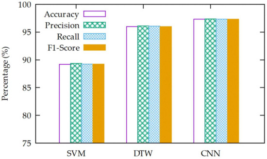 The graphs representing the performance of each classification model is shown in Figure 7. Overall, the performance of the CNN-based classification model we proposed in this article is superior in comparison with other classification models, and the SVM-based classification model shows the poorest performance. On the contrary, in comparison with the SVM-based classification model, the CNN-based classification model shows an increase in accuracy of 8.1%, precision of 8.0%, recall of 8.1%, and F1-score of 8.1%; in comparison with the DTW-based classification model, it also shows an increase in accuracy of 1.3%, precision of 1.3%, recall of 1.3%, and F1-score of 1.3% [15]. In comparison with the other classification models, the CNN-based classification model shows superior performance in all performance indices. The difference in accuracy, precision, recall, and F1-score between the SVM-based and DTW-based classification models is 6.8%, 6.7%, 6.8%, and 6.8%, respectively.