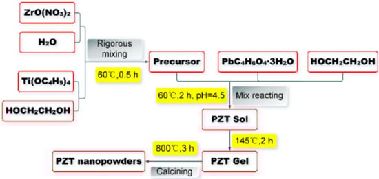 The sol-gel schematic method for synthesizing PZT nanoscale powders was demonstrated in Figure 1. Lead acetate, zirconyl nitrate, and tetrabutyl titanate were weighed to molar ratio for r(Pb)/r(Zr)/r(Ti) to 1:0.52:0.48. The resulting zirconyl nitrate–tetrabutyl titanate mixture was dissolved in 50 mL of water with a small amount ethylene glycol, and rigorously mixed together for 0.5 h at 60 °C in a collector thermostatic magnetic stirrer (DF-101S type, Zhengzhou Keda Machinery And Instrument Equipment Co., Ltd., Zhengzhou, China) filled with dimethicone to prepare the precursor. Then, the lead acetate was dissolved in ethylene glycol where c(Pb2+) was 15% [51], and slowly added to the abovementioned precursor. Glacial acetic acid and ammonia was used to adjust the pH value to around 4.5, and then reacted for another 2 h at 60 °C to fabricate the PZT sol. The PZT sol was dried at 100 °C, and residual organics were incinerated in a resistance furnace to form the pre-sintering PZT. The pre-sintered PZT was sintered for 2 h at 800 °C in a high-temperature furnace (XZK-3 type, Longkou Electric Furnace Factory, Longkou, China) [34]. The PZT nanoscale powder was obtained by grinding.
