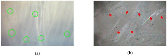 The optical morphologies of chrysotile fiber: (a) in bundle (green circles) (×200); (b) dispersed state in ethanol (red arrows) after grinding for 30 min (×200).
