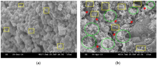 SEM images of PZT and PZTCC composite: (a) PZT (yellow rectangle, PZT); (b) PZTCC (yellow rectangle, PZT; green ellipse, cement particle; red arrow, CSF).