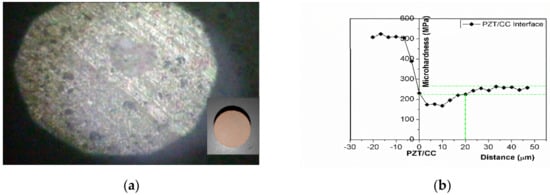 (a) An optical microscope image of the surface-polished PZTCC composite (×400) and (the insert bottom-right picture of the PZTCC composite at macro-scale); (b) Micro-hardness distributions at the PZT/CC interface.