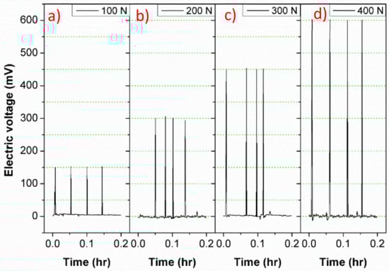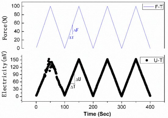 In Figure 6, the electricity output almost retains 150 mV, 300 mV, 450 mV, and 600 mV against their corresponding 100 N, 200 N, 300 N, 400 N impulses, over four repeat tests. It shows both a good linearity and a rapidity of the electrical response to the impluse level, although the d33 coefficient is relatively lower than that of common PZT wafer [35]. Figure 7 shows that the electrical voltages vary linearly with the applied cyclic force, although there is an initial fluctuations at the initial loading cycle.