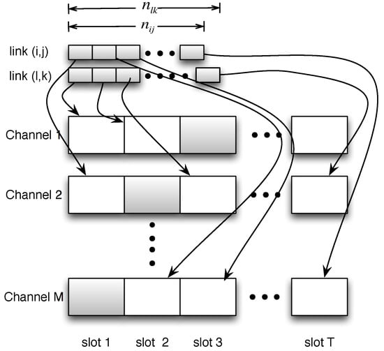 Assume is a binary indicator, where denotes that node i performs a broadcast in channel m at time slot t. The problem can be formulated as: