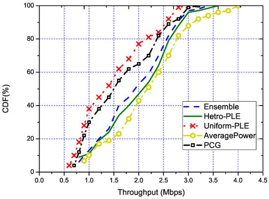 The CDF of throughput using different RSS estimation algorithms. PLE, Path Loss Exponent.
