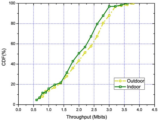 Regarding the performance of our algorithm in outdoor and indoor scenarios separately, we conducted statistical experiments. The experiments were conducted in 30 scenarios each for the SWIM dataset and MetroFi dataset. Same as the overall experiments, we used the throughput optimized result as the benchmark to quantize the performance of our algorithm. The results are shown in Figure 4, from which we can see that in the smaller sized network, our algorithm performed almost the same between indoor and outdoor scenarios. Meanwhile, when the network size grew (indicated by the increase of network throughput), our algorithm performed much better in the scenario of the outdoor environment. This is mainly due to that the core of our solution being the PLE-based model, which is more accurate in outdoor environments []. Moreover, in the indoor environment, the signal propagation is much more complex. The signal propagation model cannot capture the interference from the unknown signal source, which is much denser in the indoor environment.