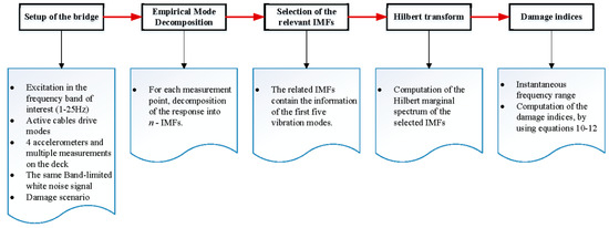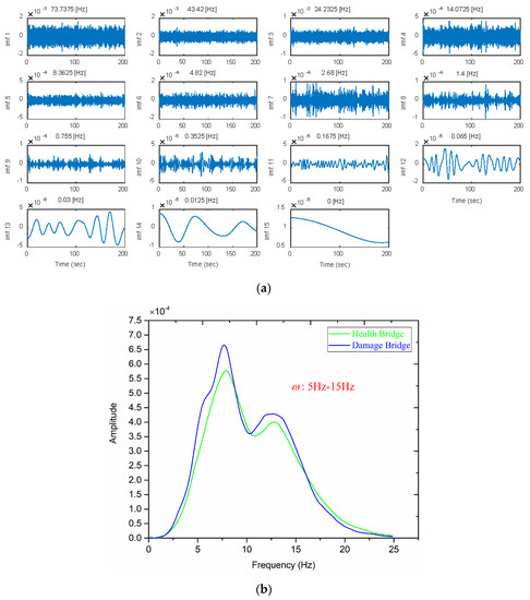 - Second, the data from the same measurement points (damaged and undamaged) are decomposed into n-empirical modes (IMFs). By analyzing the central frequencies of the IMFs, the related IMFs are selected which contain the information of the dominant modes (for the considered bridge, the first five vibration modes).