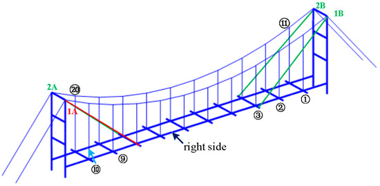 - Finally, in this paper, we consider the influence of noise and ignored the influence of environmental and operational variability on the dynamic behavior. It is well known that suspension bridges are insensitive to tiny damages. Thus, a small damage intensity would be detectable by this method (equivalent to 80% reduction of the hanger tension), which is a satisfactory result. Nevertheless, to confirm these findings, the extension to field experiments under realistic conditions should be further investigated. More importantly, some quantitative results can be obtained. A potential test case would be the Seriate footbridge, located in Bergamo, Italy, and considered as a test case in a previous study [22].