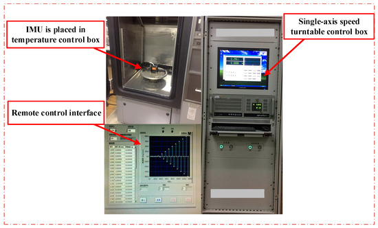 A single axis temperature-controlled turntable provides accurate angular velocity and temperature input in Figure 3. Based on the above tri-axial MEMS gyroscope error model and calibration method, the MEMS-IMU was fixed on a high-precision hexahedron, and the experiments were performed at different temperature points to acquire the error vector matrix, after which the calculation results were compared and analyzed.