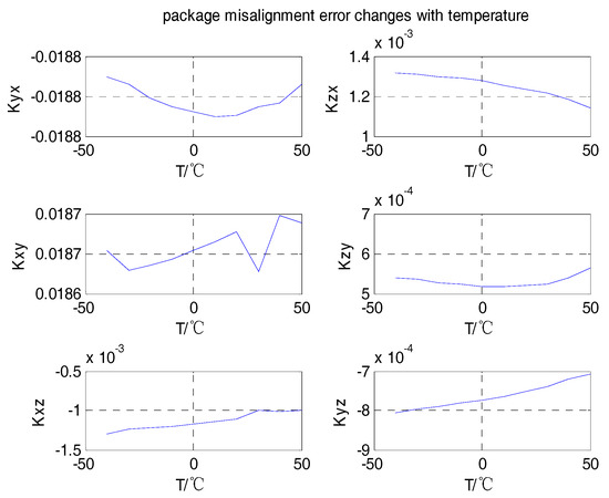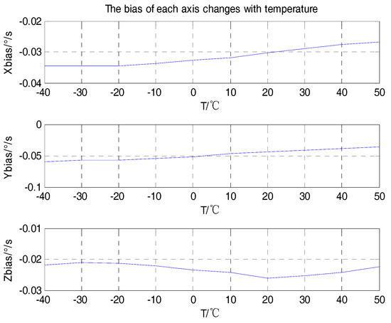 From the analyses shown in Figure 4, Figure 5 and Figure 6, we can see that the scale factors of the tri-axial MEMS gyroscope showed a linear relationship with temperature. The bias output also changed with temperature. The values of the package misalignment error were large, which was identified as the main cause of package misalignment error, but unexpected non-orthogonality error was generated when there was a high dynamic environment. The other package misalignment errors were relatively small. Furthermore, as can be seen from the trend, the change of temperature did not affect the value of the package misalignment error.