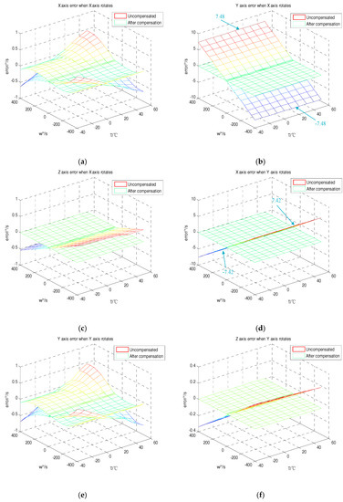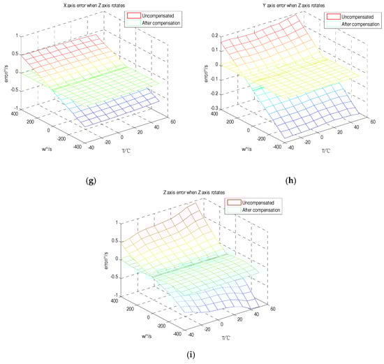 The three-dimensional figure of each rotation speed and temperature was shown by plotting the error of each axis of the gyroscope before and after compensation, as in Figure 7. According to the analysis, the tri-axial MEMS gyroscope was compensated using the error coefficients at different temperatures. It can be clearly seen that the error before and after the compensation was significantly reduced. From the analysis of Figure 7b,d, in the range of −400 °/s to 400 °/s, the non-orthogonality error of the Y-axis when the X-axis rotates and the non-orthogonality error of the X-axis when the Y-axis rotates were 7.48 °/s–−7.48 °/s and −7.42 °/s–7.42 °/s, respectively. This result is consistent with the fluctuations in the package misalignment error between the two axes analyzed earlier, which were around −0.0188 and 0.0187. Since the package misalignment errors between the Z-axis and the X-, Y-axes were small, the non-orthogonality error value had a smaller fluctuation range. However, the proposed method can also compensate well for the non-orthogonality error when the Z-axis rotates. This proves the correctness and feasibility of the proposed method.