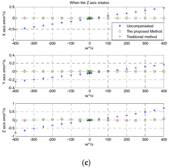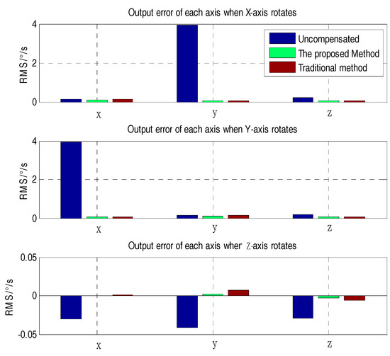 From Figure 8, it can be seen that the proposed method and the traditional method have better compensation results than the uncompensated one. To further analyze the effect of the two methods, the (RMS) error of each axis was adopted to characterize the compensation effect. From Figure 9, it can be seen that the RMS error of the proposed method and the traditional method were obviously lower than that of the uncompensated condition. In contrast with traditional method and the proposed method, the X-axis error when the X-axis rotates and the Y-axis error when the Y-axis rotates were decreased by 26.75% and 25.64%, respectively. The Y- and Z-axis error compensation effects when the X-axis rotates were slightly improved. The X- and Z-axis error compensation effect when the Y-axis rotates was basically the same. Due to the large package misalignment error between the X- and Y-axes, when rotating within ±400°/s, the non-orthogonality error compensation effect reached an approximate level. However, when the Z-axis rotates, the X, Y, and Z errors were significantly reduced by 55.50%, 75.36% and 48.33%, respectively, as compared to the conventional methods. Specific comparisons are shown in Table 4.