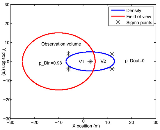 The predicted probability density function is shown by a GM. The blue circle is one Gaussian item. V1 represents the part inside the observation volume, and V2 represents the outside part. ∗ represents the sigma points obtained by the unscented transform. is an example of the detection probability inside the observation volume. Since there is no measurement from outside the observation volume, the detection probability is set to . The EM algorithm is used to build a new GM to represent V1 and V2, respectively.