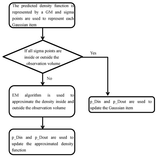 We assume that the single object density is represented by a Gaussian mixture (GM). Since UKF is used in this paper for the space debris transition function, each Gaussian item is represented by a bunch of sigma-points. If all sigma-points are inside or outside the observation volume, the detection probability for this Gaussian item is set to and , respectively. is the detection probability inside the observation volume and is the detection probability outside the observation volume. Otherwise, the EM algorithm is used to build a new GM to approximate the current Gaussian item.