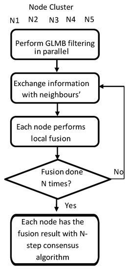 A approach can be used in a distributed system to achieve global information fusion over the network [9,10]. Consensus has emerged as a useful tool for parameter estimation and distributed information fusion [11,12]. The logic behind consensus is to reach a global average by allowing each node to perform iterative local averages [13]. Global average and local average are achieved with information fusion over the whole network and neighboring nodes, respectively. The information can be propagated throughout the entire network with such repeated local information fusion [14,15]. The computation load for each node only depends on the number of its neighboring nodes. The calculation for each node does not increase dramatically with the number of nodes in the whole network [16,17]. A consensus approach for multi-target tracking with labeled random finite set (RFS) filtering was presented in [18]. The for probability densities can be used to achieve consensus for distributed estimation in a general state space model [19].