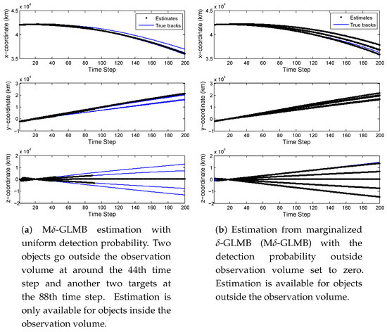 The space debris tracking problem has been an active research area [33,34,35,36,37,38,39,40]. A space object tracking approach with CPHD filtering and a measurement-based birth model was presented in [41]. A labeled multi-Bernoulli filter for space object tracking was proposed in [4]. GM-CPHD filtering and a consensus algorithm were used in [42] to achieve global space object tracking. A consensus algorithm was used for distributed information fusion. Even though estimation performance was promising, object trajectories were not available. Preliminary results to track space debris with consensus LMB filtering was proposed in [40], which can only provide state estimation for targets inside of the observation volume and fuse information from sensors with the same observation volume.